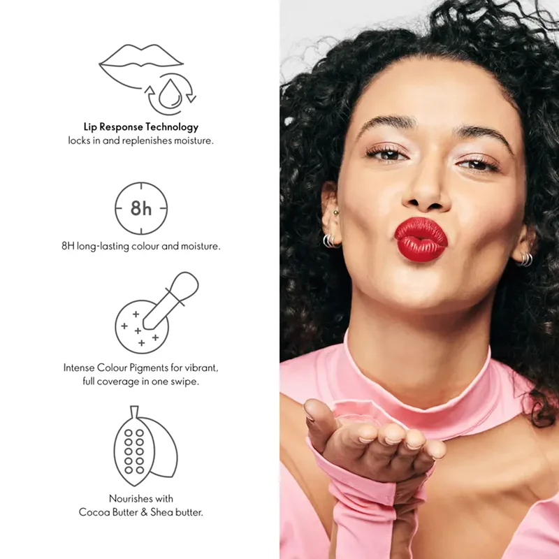 رژ لب مرطوب کننده که رنگ و آبرسانی بیشتری را برای ظاهری خیره کننده به لب ارائه می دهد که در تمام طول روز در جای خود باقی می ماند.رژ لب با ماندگاری 8 ساعته و مرطوب کنندگی ماندگار. لب ها را با کره کاکائو و کره شی تغذیه می کند.15 رنگ رژ لب جذاب که برای هر رنگ پوستی طراحی شده اند.